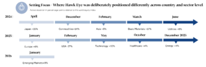The actively managed Hawk-Eye certificate consists of 60 to 100 liquid international equities with the aim of outperforming the global equity market over the long term with comparable risk. The investment strategy is based on the belief that markets are driven by emotions and investor behavior. By combining chart analysis, sentiment indicators, and quantitative models, recurring patterns and trends are identified at an early stage. Stock selection is discretionary within a rule-based framework. The certificate follows the UCITS-compliant 5/10/40 rule and uses targeted country and sector deviations to actively seize opportunities.