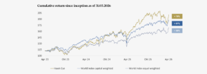 *Relative outperformance fee compared to the capital weighted global stock market On April 28, 2025, the currency conversion from CHF to USD was carried out with the allocation of a new ISIN. DOWNLOAD FACT SHEET HERE